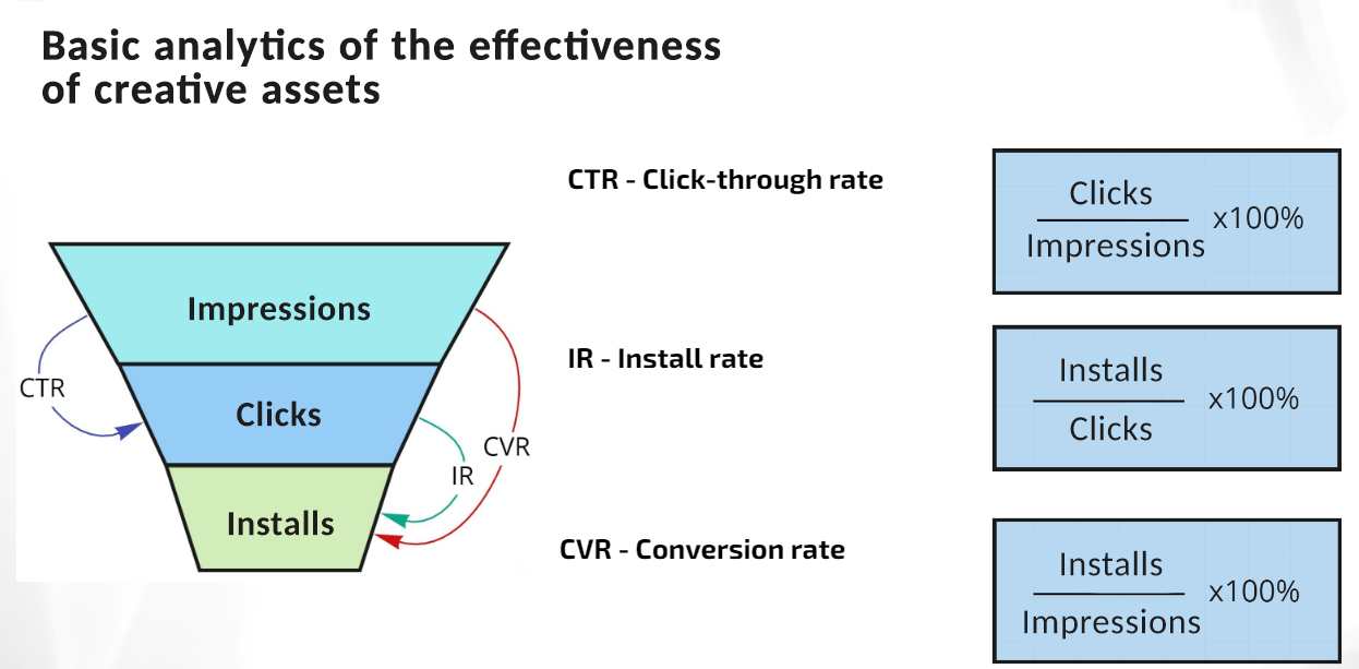 Conversion rate (CVR) is directly proportional to the metrics mentioned above. Conversion can vary depending on the goal of your ad campaign. For basic analysis, we take the CVR as the ratio of impressions to game installs. This metric shows how good your creative asset is overall.