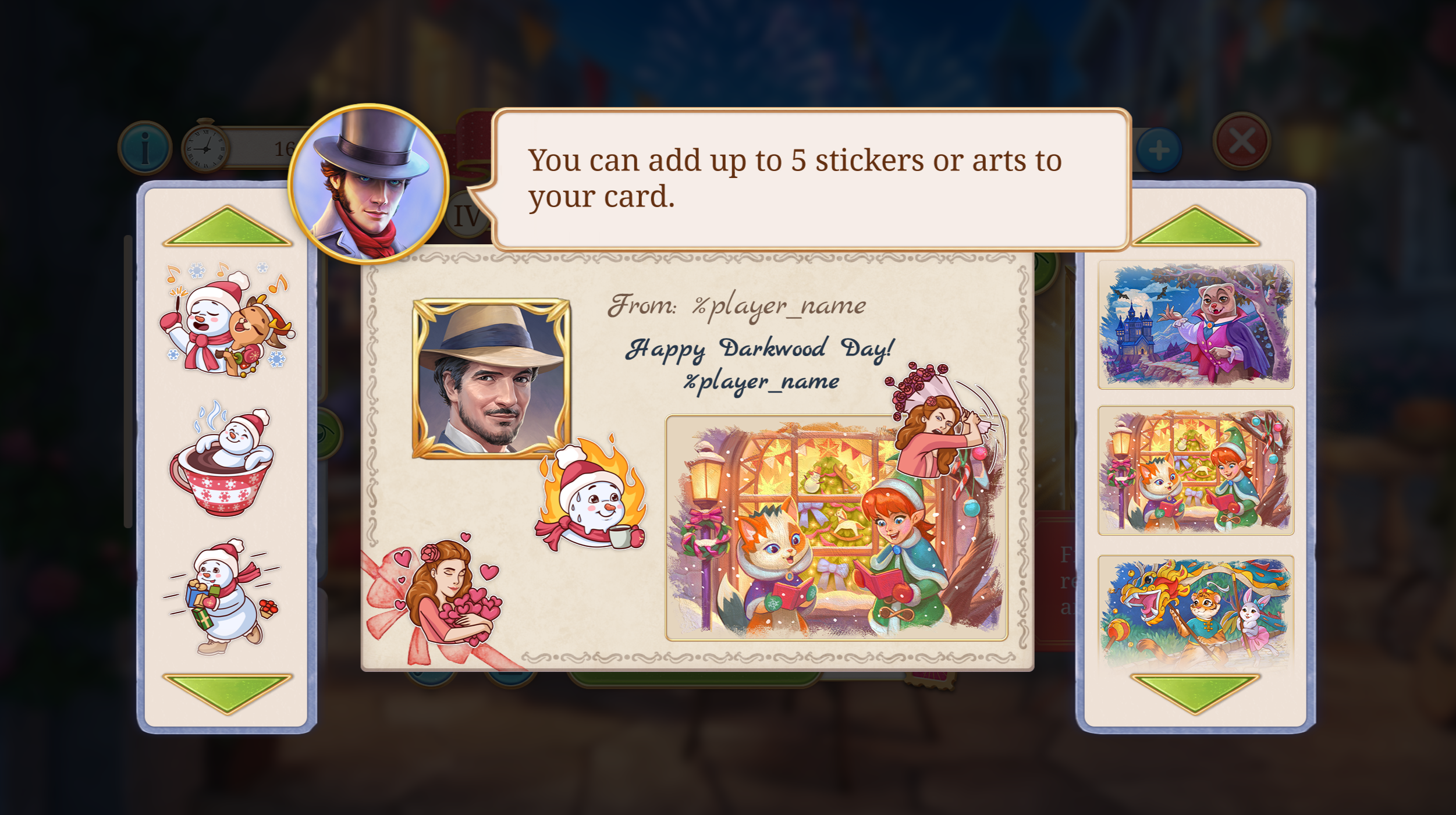 Seekers Notes is more than just a game—it's a social hub. In just one year, the game added over 8,000 new guilds, bringing together like-minded players from around the world. The total number of created guilds has surpassed 102,000! The Darkwood Mail event highlights the popularity of the game's social component. First released on Valentine's Day in 2023, Darkwood Mail quickly gained popularity: since its release, the number of players who have taken part in the event has grown from 20% to 50%, thanks to updates, new designs, and an increase to the event time. In the anniversary version of the event, players can decorate cards with stickers and images for the first time. In total, over 20 million cards have been sent—and that number is still growing!